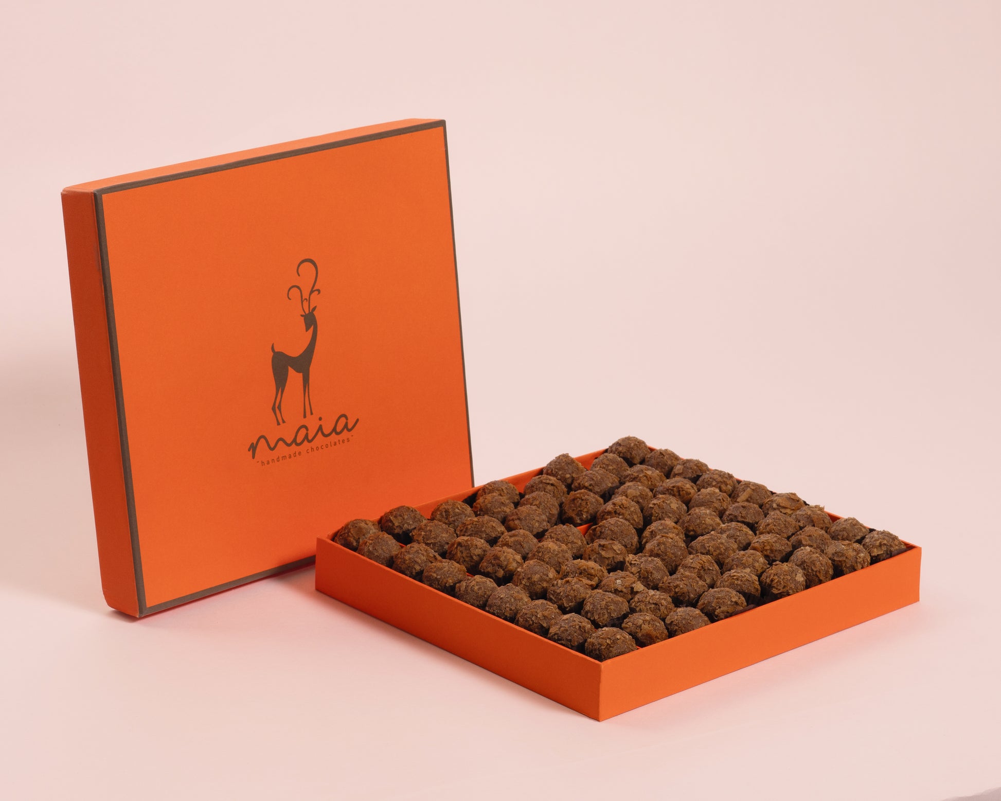 استمتعوا بتجربة فريدة مع ترافل الطحينة المصنوع يدويًا في علبة برتقالية كبيرة. مُعدّة للمناسبات والهدايا.