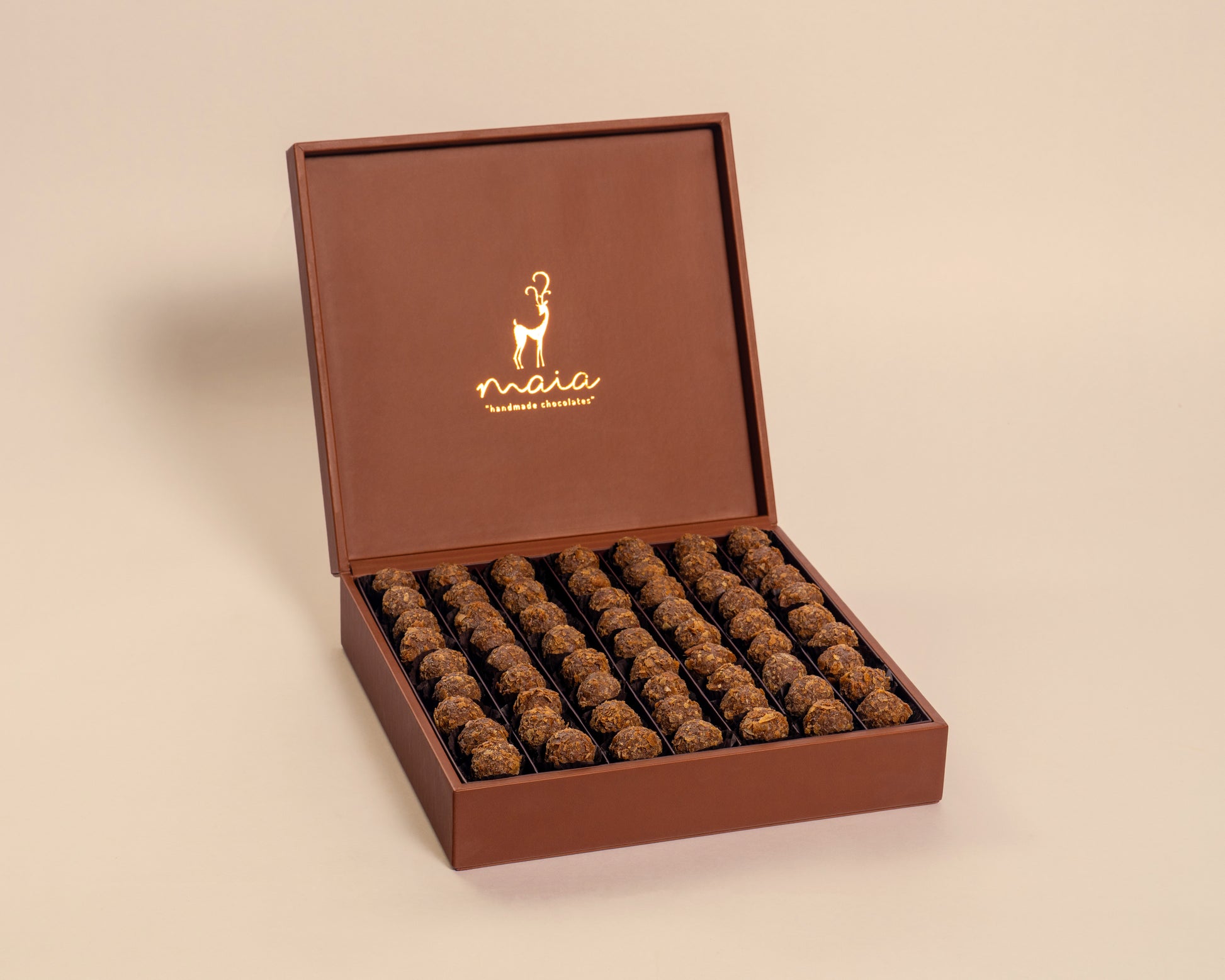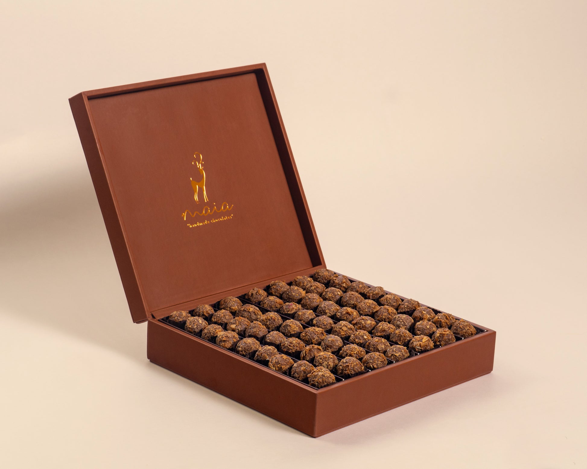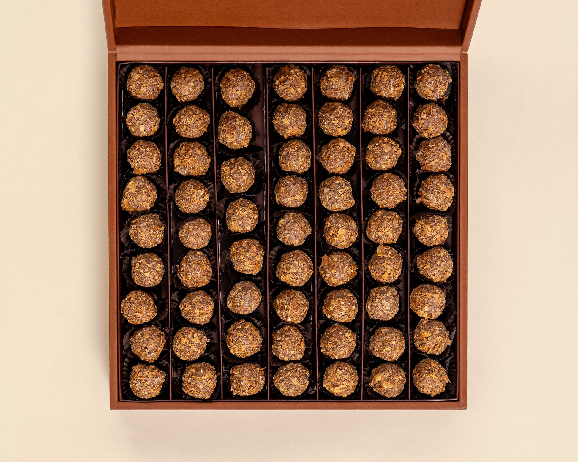 استمتع بنكهة ترافل الطحينة الرائعة، المقدمة بشكل أنيق في صندوق جلدي فاخر.