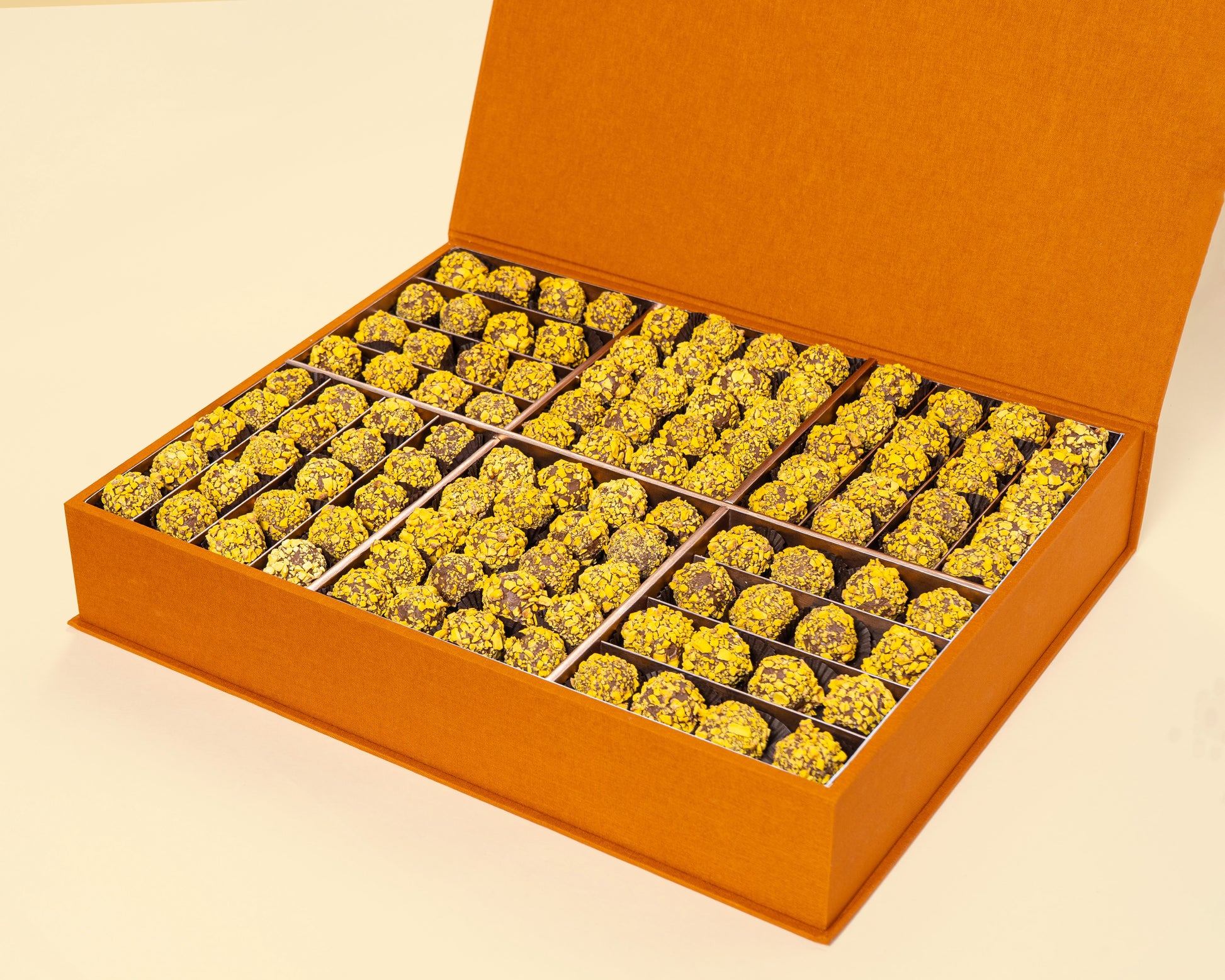 احتفل بأسلوب رائع مع كرات المانجو المصنوعة يدويًا في صندوق برتقالي فاخر وجريء وجميل.