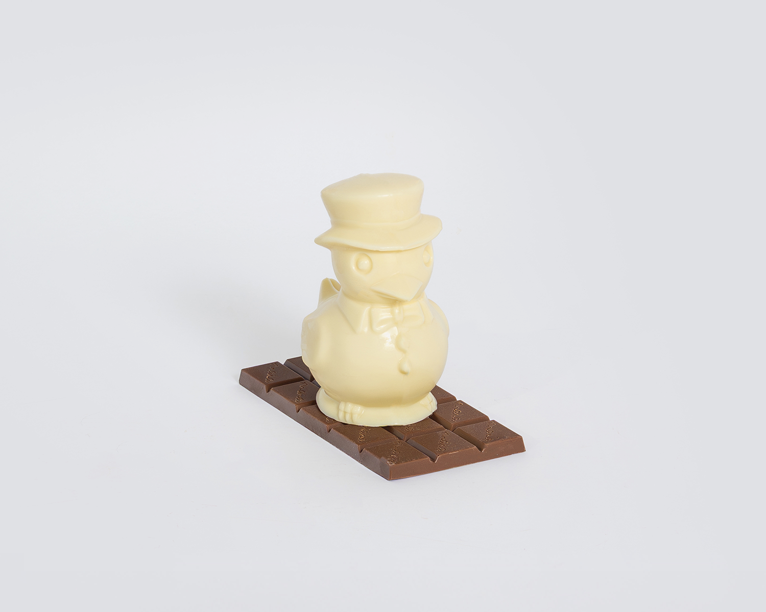 White chocolate, shaped in special molds in the shape of a duck, is a decorative chocolate variety that stands out with its creamy texture and light vanilla flavor. The body, beak, wings, and tail are meticulously crafted for a charming and eye-catching appearance. It's a visually and flavorfully pleasing choice for gifts, special occasions, themed events, and children's chocolate sets.