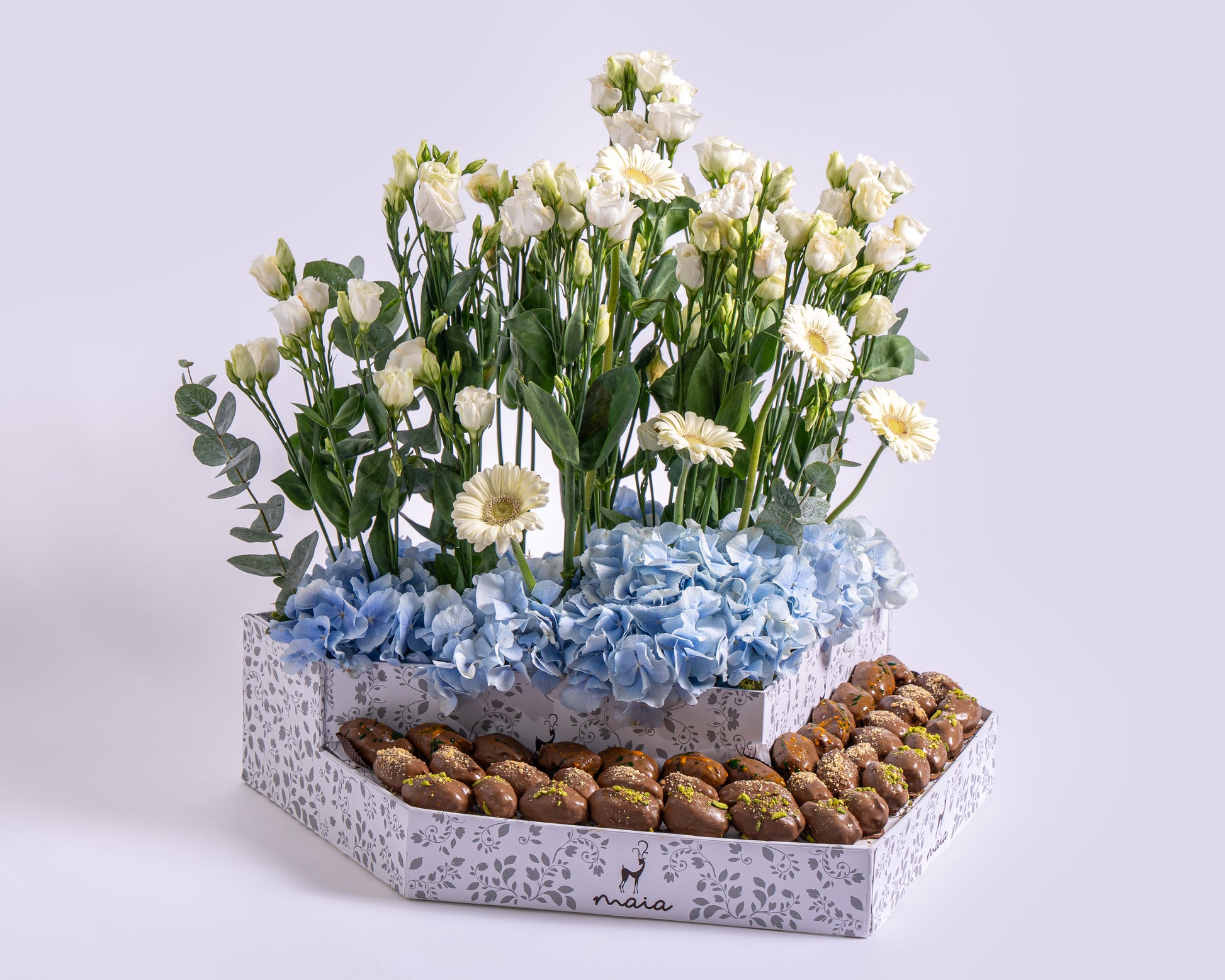 Quantity: 5 stems blue hydrangea, 10 stems white eustoma, 5 stems white gerbera with fillers. Paired with 1.1 kg of premium chocolate dates.
