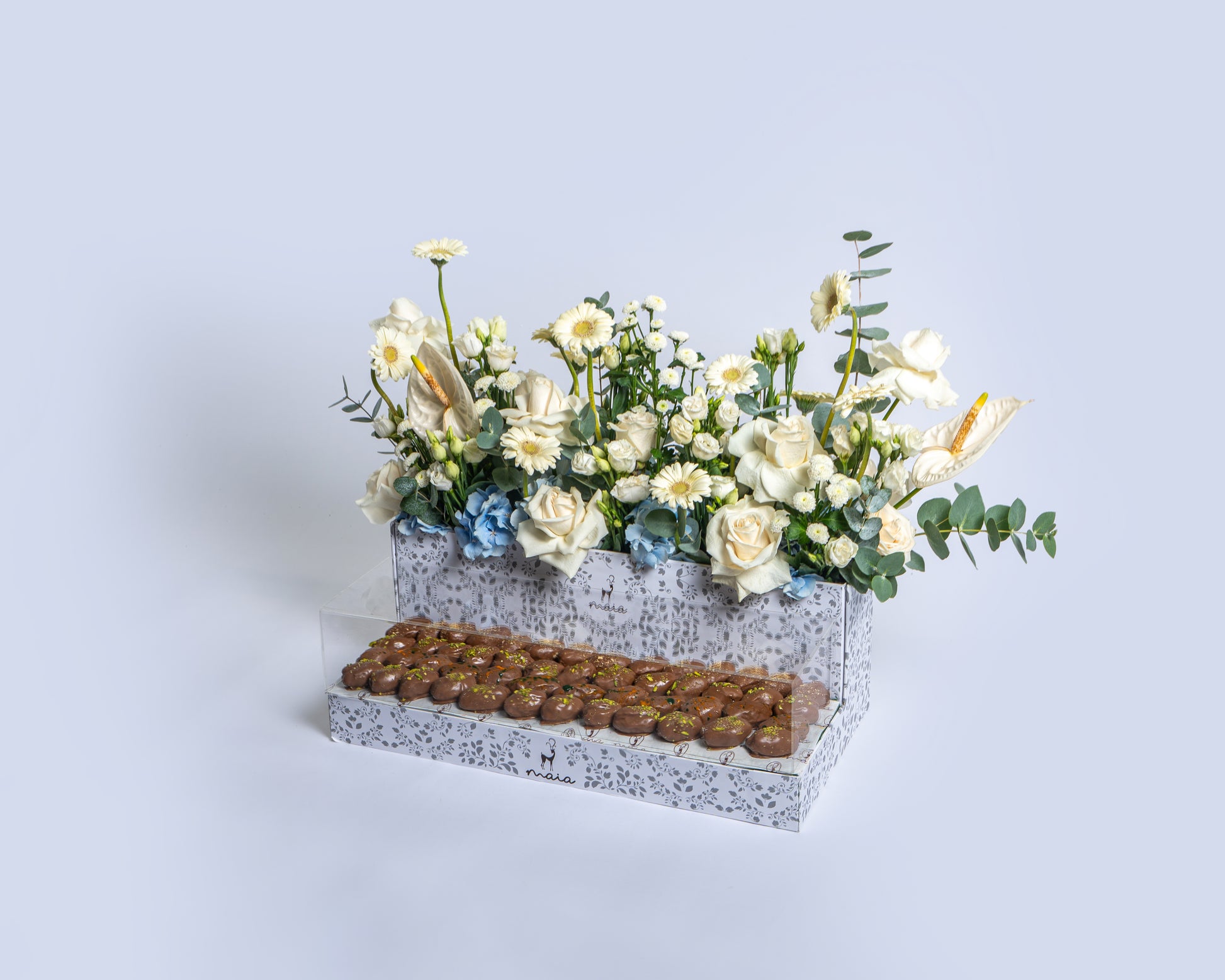 Quantity: 3 stems white anthurium, 10 stems white roses, 10 stems white gerbera, 10 stems white eustoma, 3 stems blue Holland hydrangea, 5 stems white chrysanthemum santini with eucalyptus. Paired with 2.2 kg of premium chocolate dates.