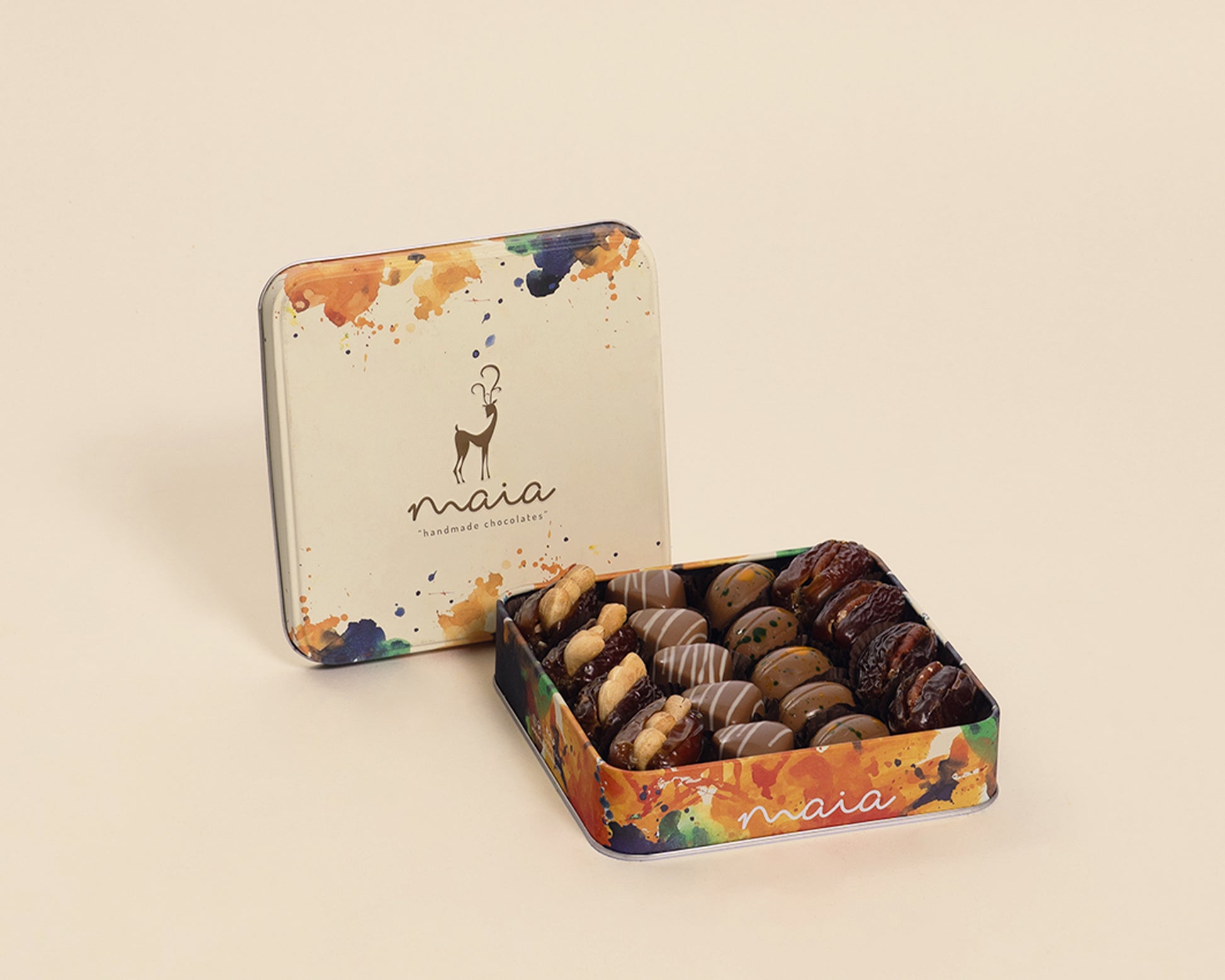 This 350-gram assortment of chocolates and dates with nuts is presented in a medium metal box. It’s a perfect, compact treat for personal indulgence or a small gift.