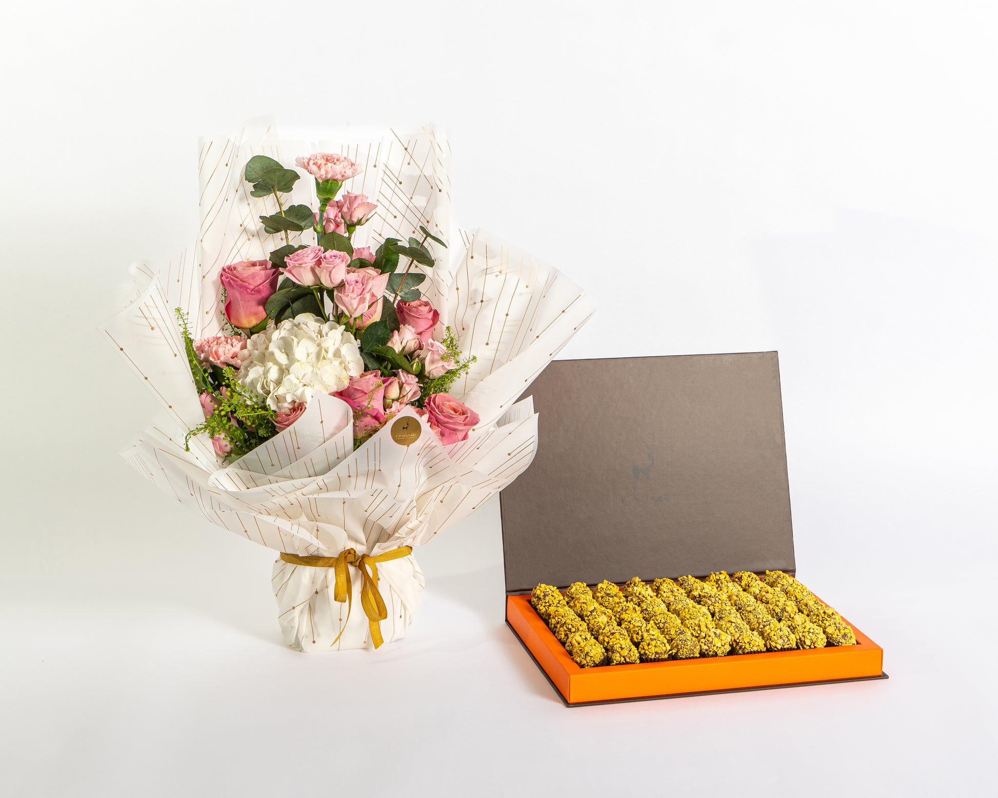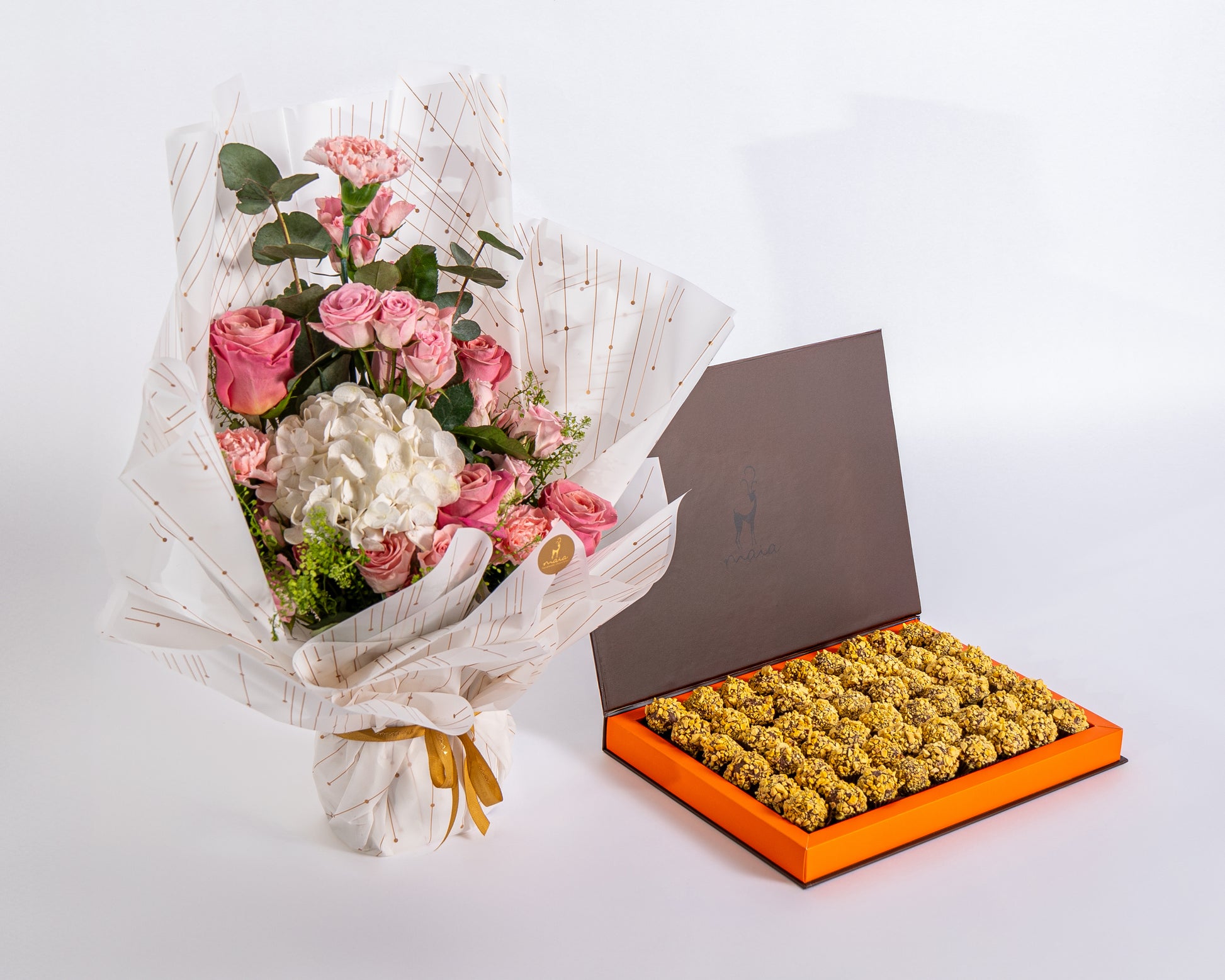 Soft and romantic, this elegant pink bouquet blends delicate roses, hydrangea, and spray roses for a feminine and graceful composition.Flower Composition: 4 Pink Roses, 1 Hydrangea, 3 Spray Roses, 2 Carnations, 2 Eucalyptus stems, and 2 Green Bells.Design & Presentation: Beautifully wrapped and presented beside a signature chocolate box.Perfect For: Romantic gestures, birthdays, or heartfelt appreciation.Added Touch: The curated chocolate box enhances this gift with a sweet finishing note. 650 gram mango truffles with premium madlen cartoon box