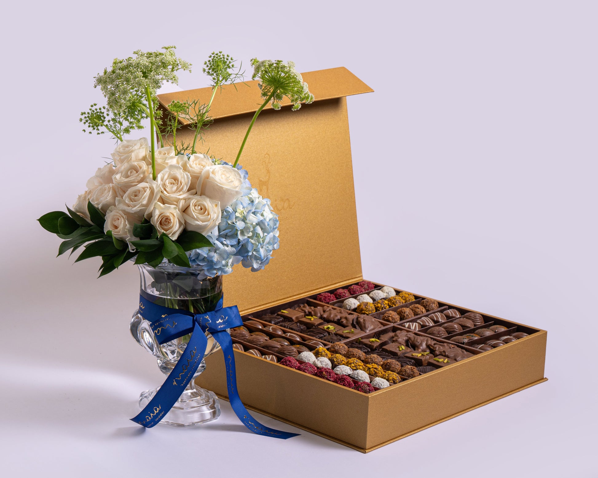 Presentation: A dazzling arrangement in a crystal vase, with an elegant gold chocolate box.