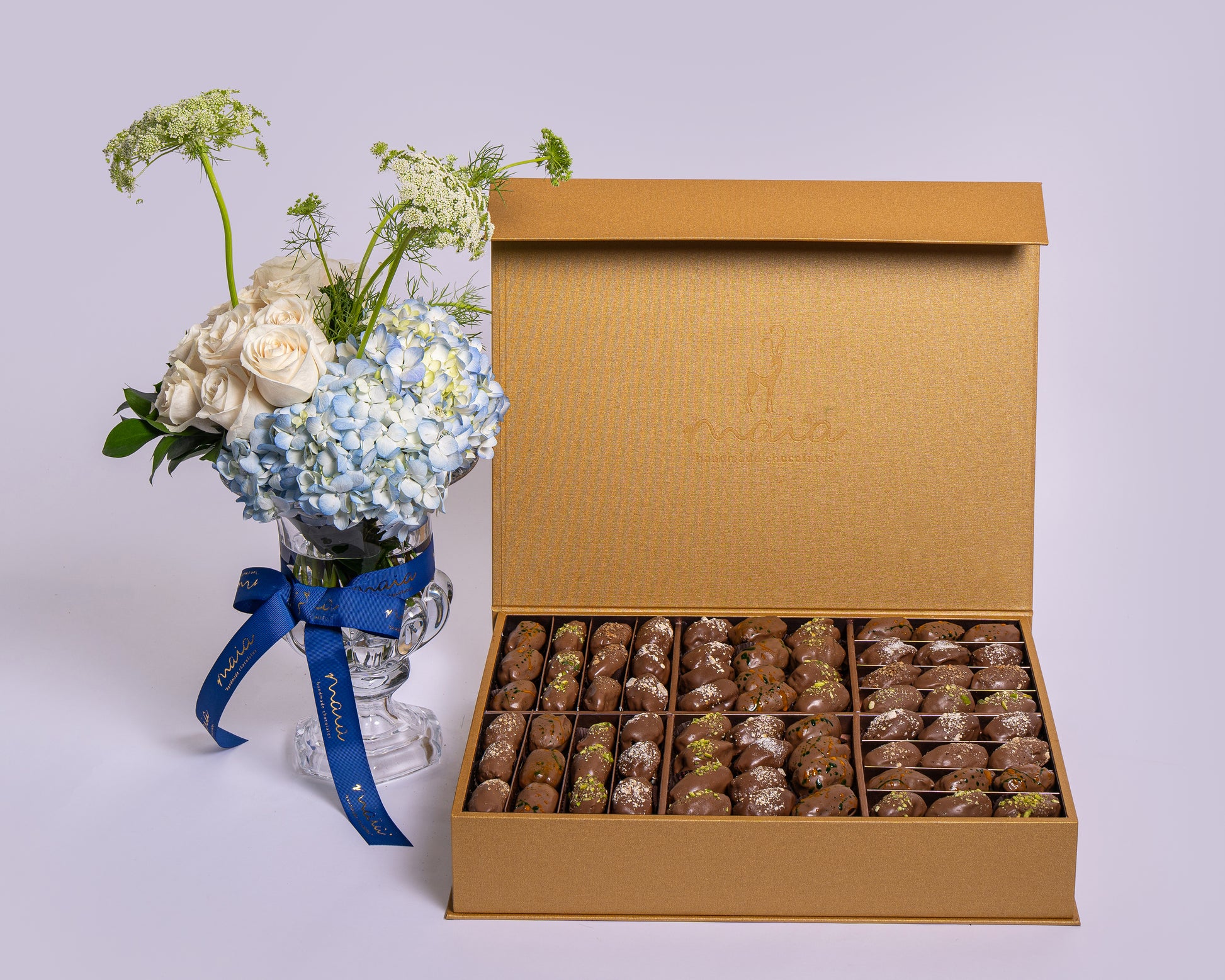 Presentation: A premium gold box of chocolate dates paired with an exquisite floral arrangement.