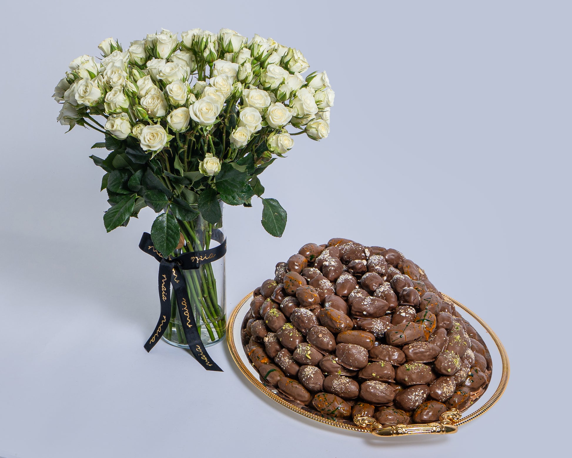 Quantity: 20 stems spray roses in a glass vase, paired with 4.8 kg of premium chocolate dates.