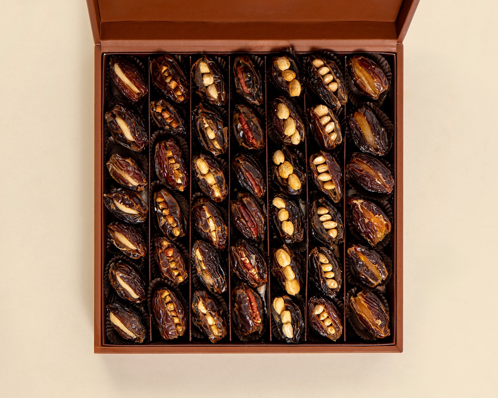 Unveil a world of luxury with our Premium Handmade Dates with Nuts, presented in a stunning Premium Leather Box. This 1.2 kg collection is the ultimate high-end gift.