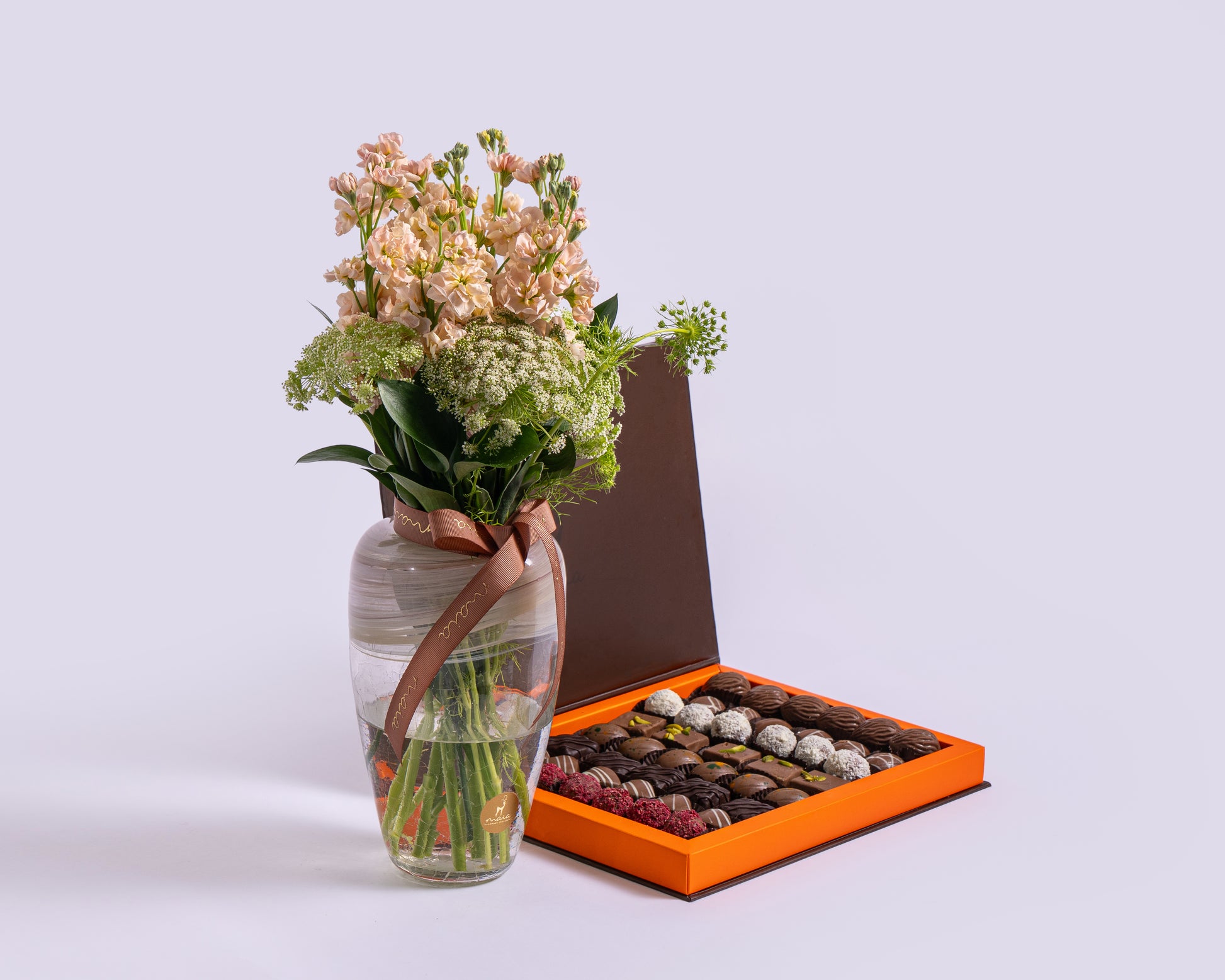 Presentation: Fresh flowers in a refined vase paired with a carefully curated chocolate box.