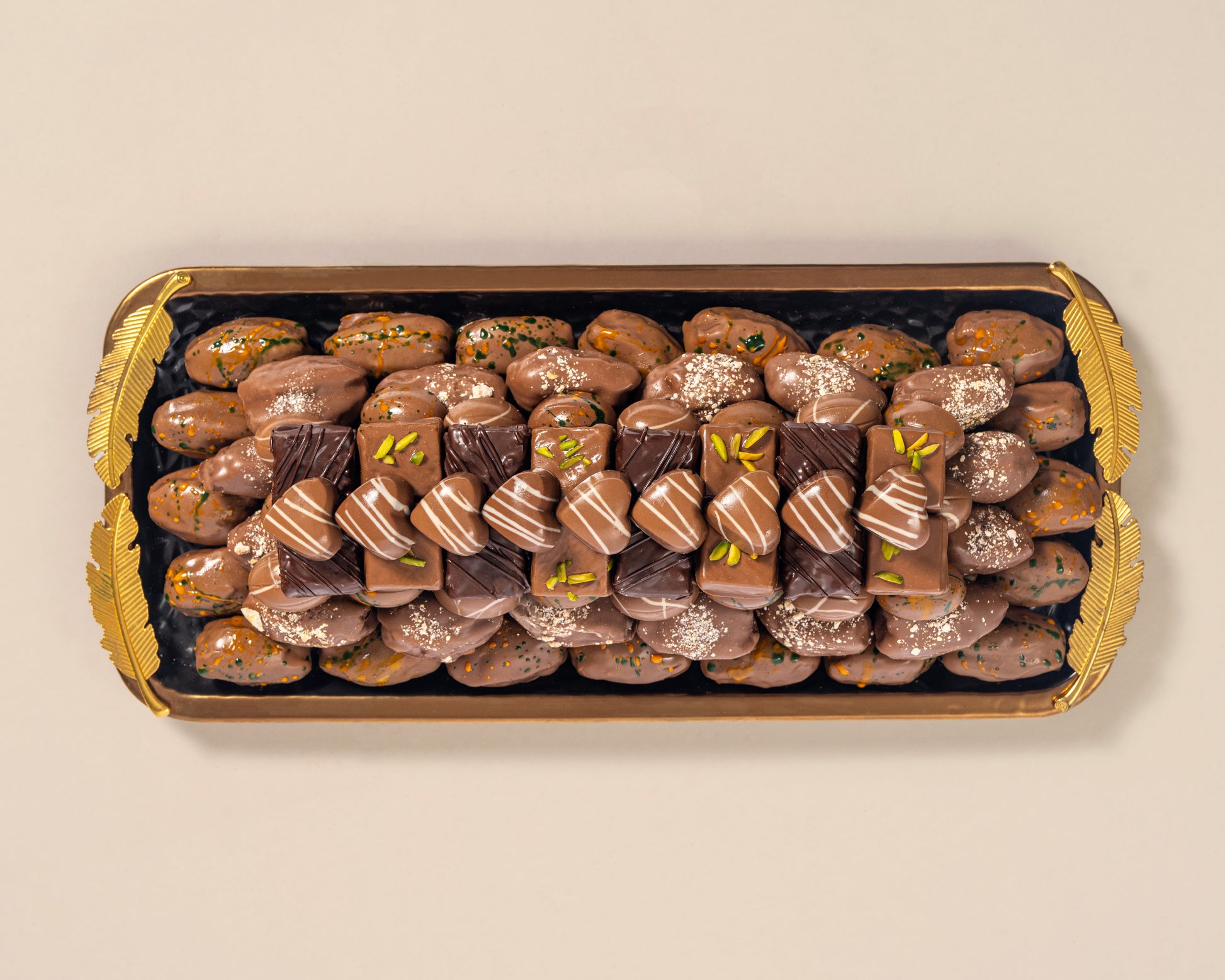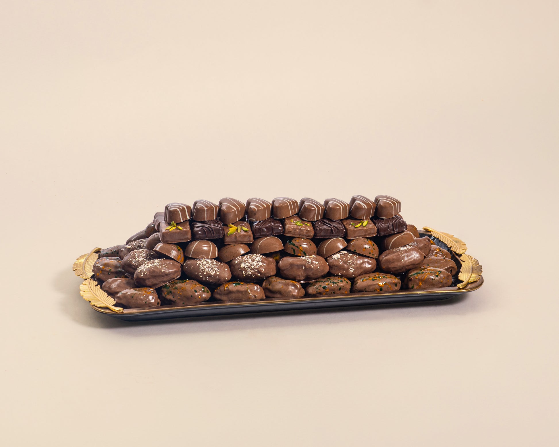 This 2800-gram assortment of chocolates and chocolate dates is showcased on a premium rectangle black tray. Its sleek, modern design makes it a stylish choice for any elegant event.