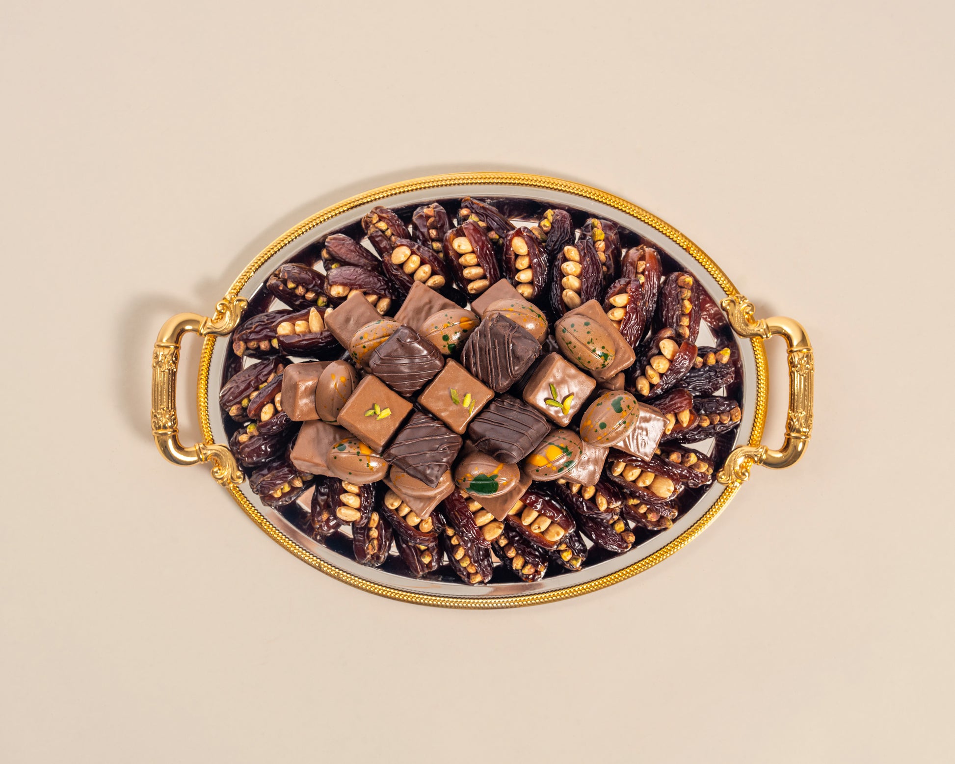 A 1900-gram assortment of chocolates and dates with nuts is beautifully arranged on a premium small metal tray. It's a compact yet generous option for smaller gatherings or as a large personal gift.