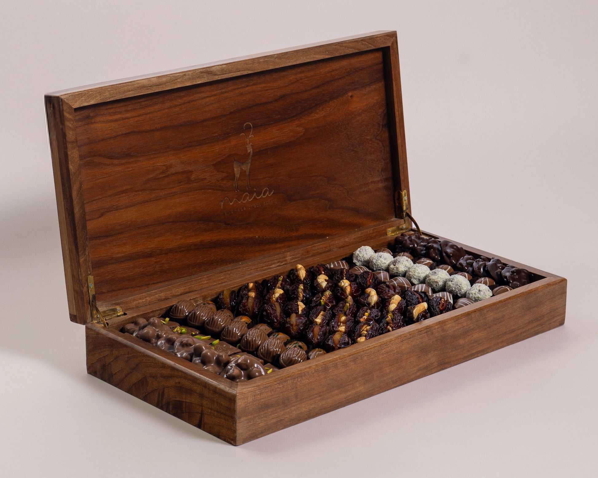 A curated 1500-gram assortment of chocolates and dates with nuts is presented in a beautiful wooden box. This is a unique and stylish alternative to a traditional box or tray.