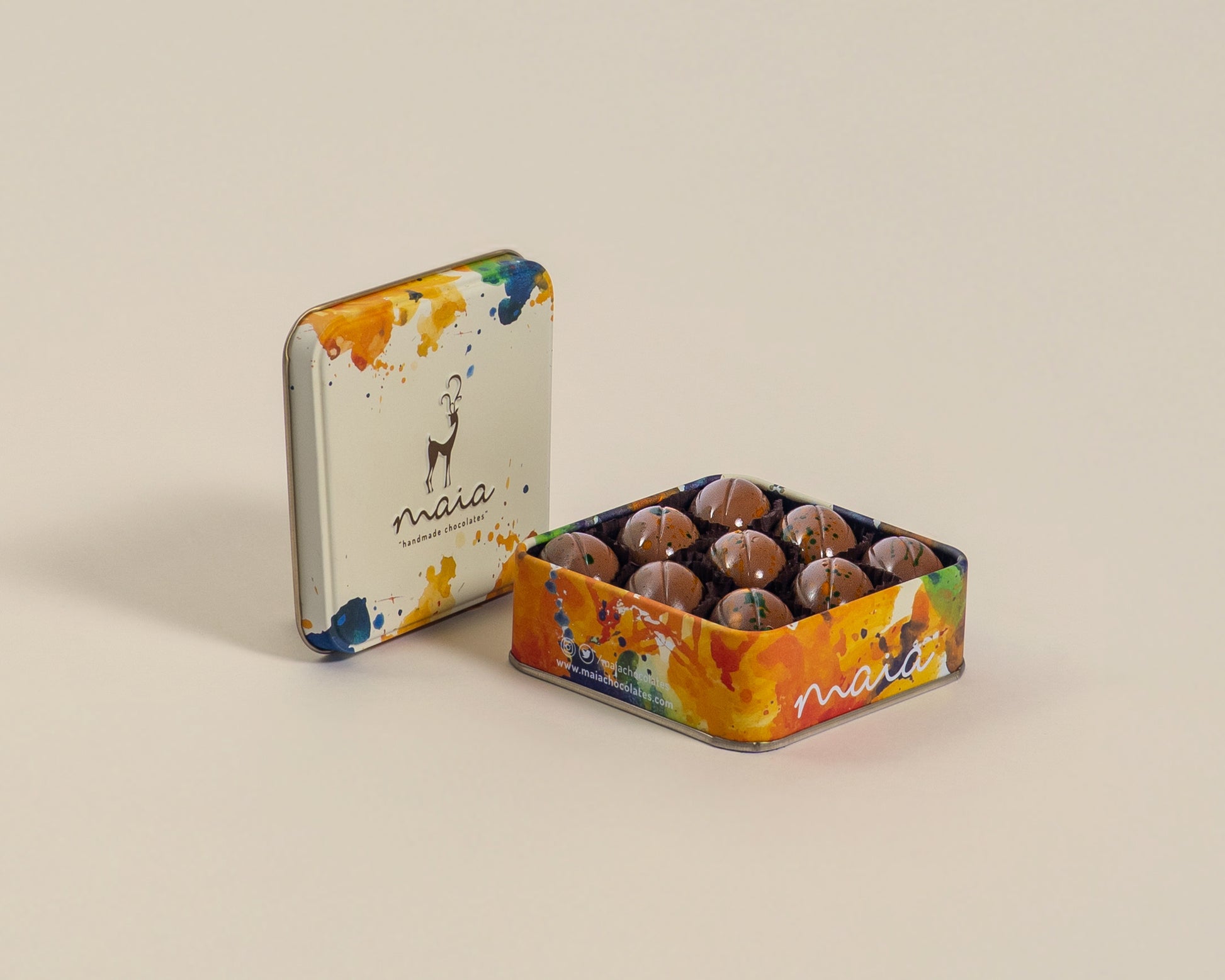 Discover the richness of Dubai Chocolate in a sleek small metal box.