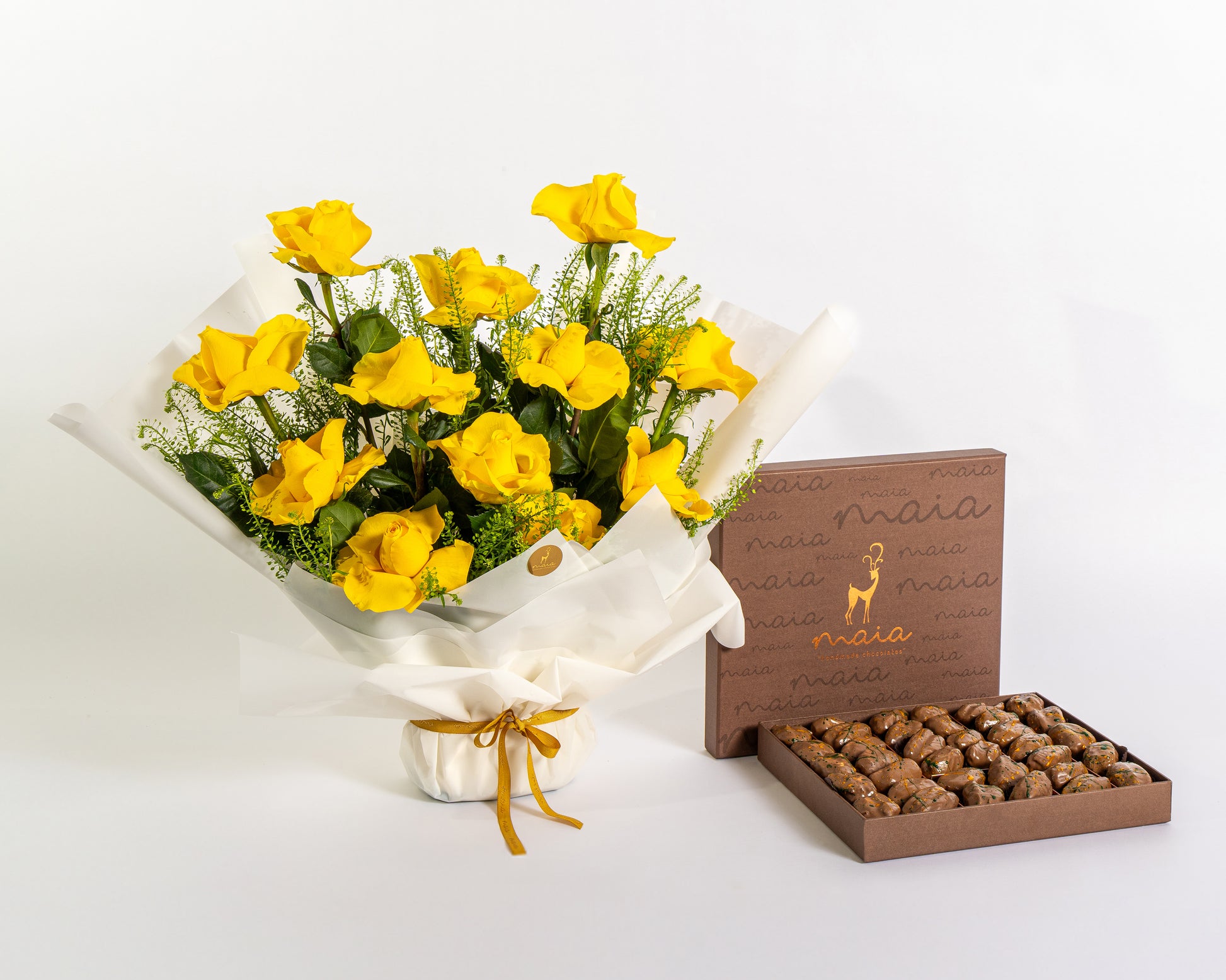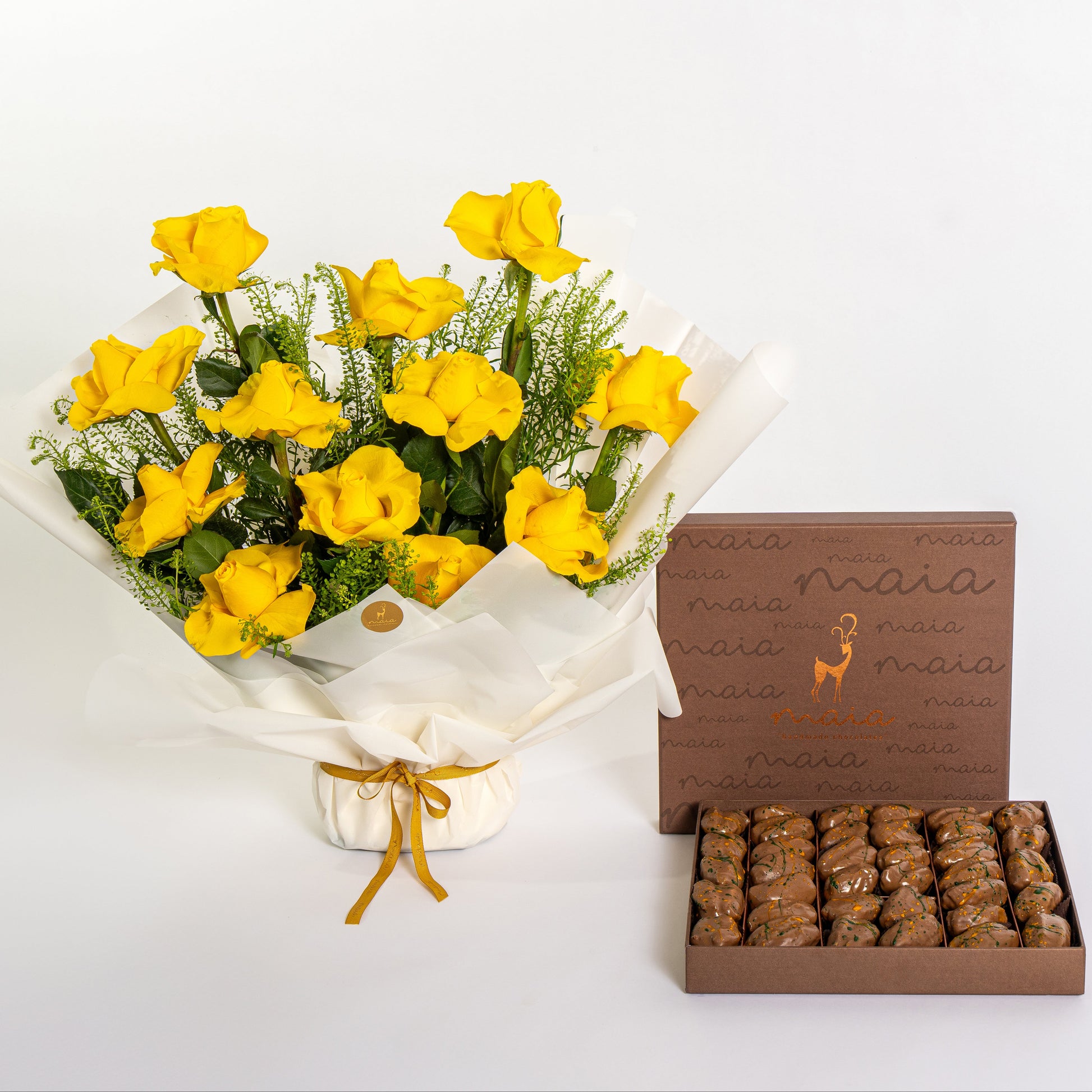 A refreshing floral display designed for modern interiors or thoughtful gifting.Flower Composition: 10 Spray Roses and 4 Eucalyptus stems.Design & Presentation: Comes beautifully arranged in a clear vase.Perfect For: Home décor, birthdays, or casual gifting.Added Touch: The vase presentation offers a long-lasting and ready-to-display gift. 1000 gram dubai date with premium brown cartoon box