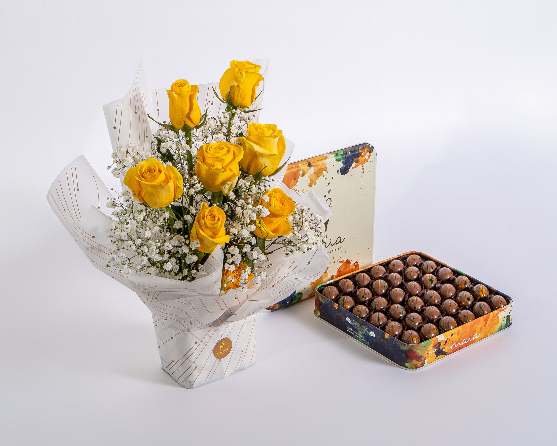 Playful and colorful, this vibrant bouquet adds a touch of joy to any setting.Flower Composition: 10 Spray Roses, 1 Gerbera, and touches of Green Bell.Design & Presentation: Arranged with flair and presented beside a chocolate box.Perfect For: Cheerful celebrations or spontaneous surprises.Added Touch: Paired with chocolates for a fun and complete gift. 500 gram dubai chocolate with large metal box