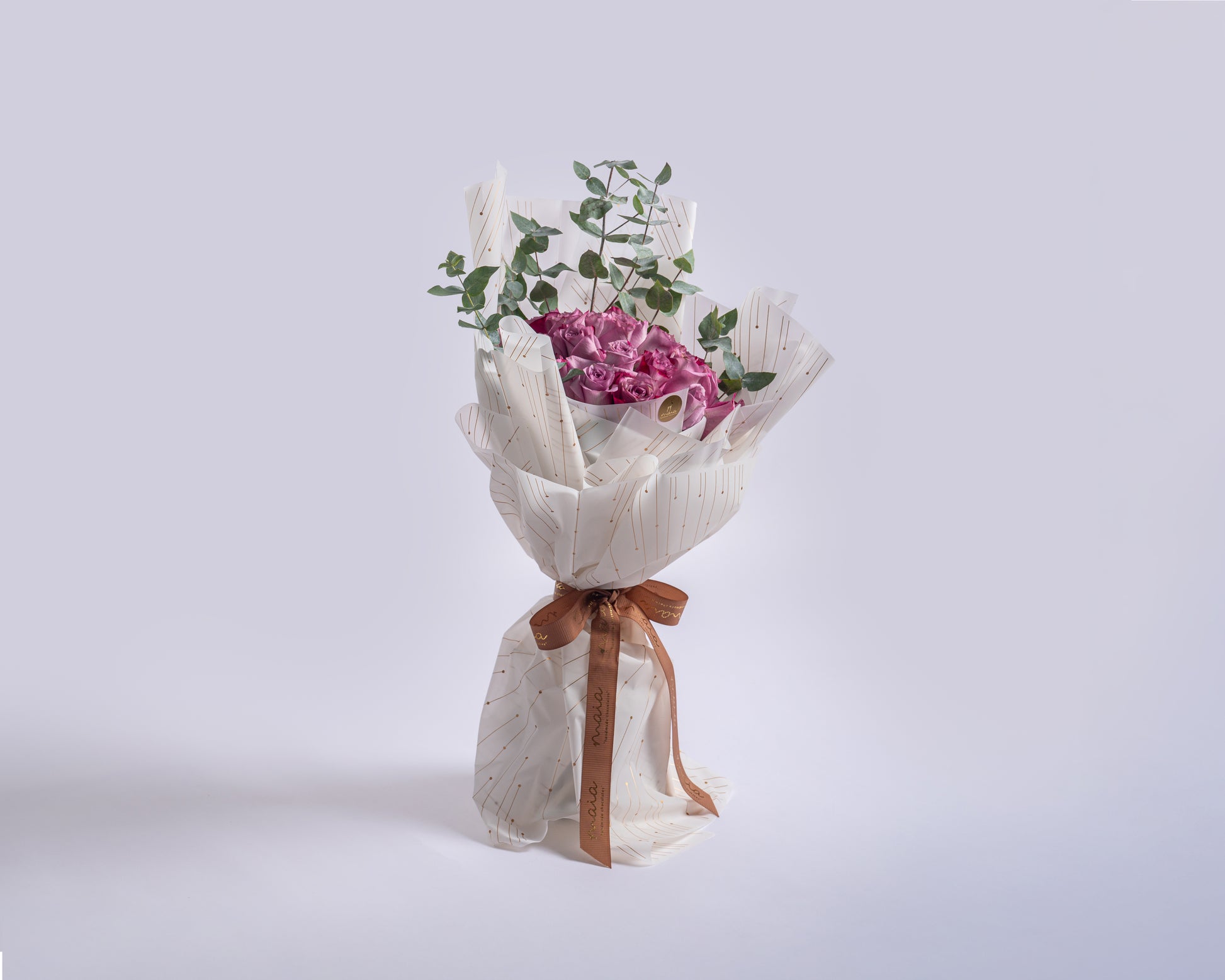 Quantity: 25 stems purple haze roses with eucalyptus leaves.