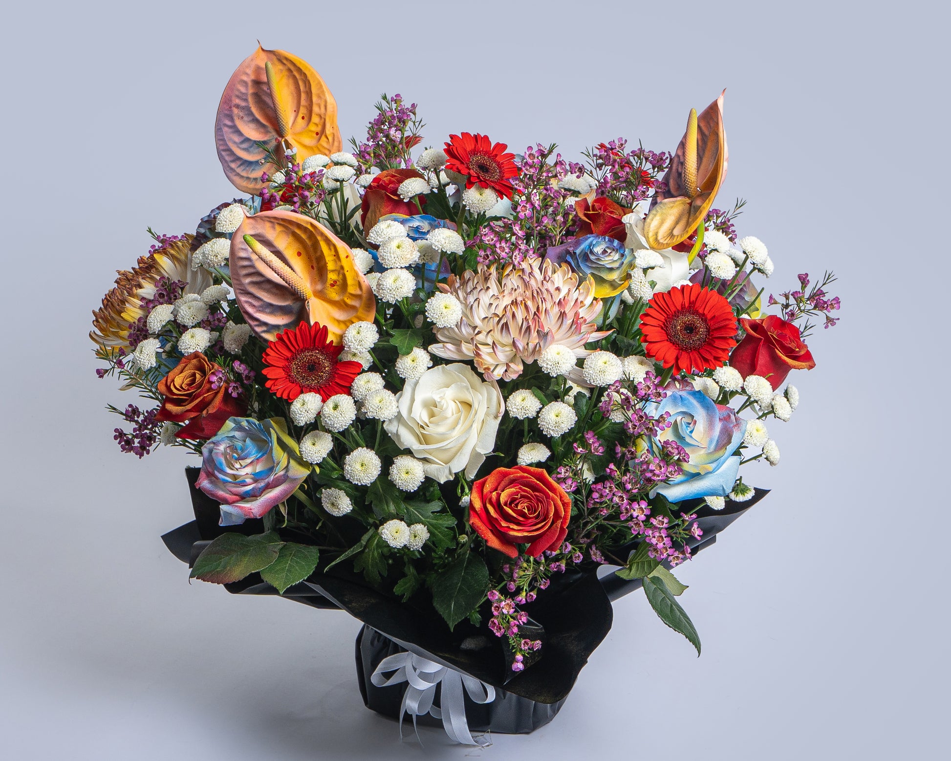 A colorful and creative bouquet featuring painted roses and vibrant accents.