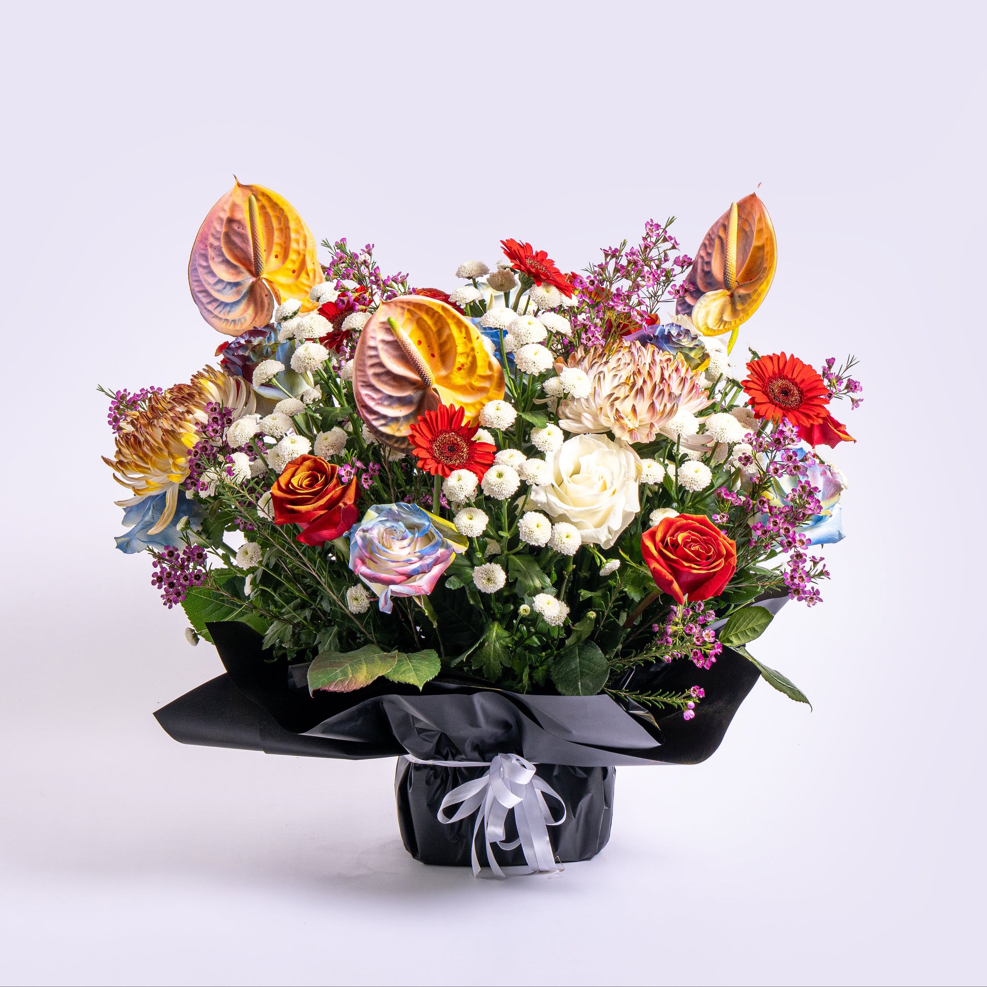 Presentation: An artistic bouquet with bold colors and striking painted florals.